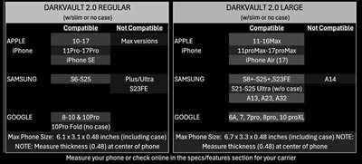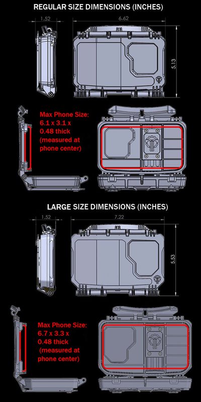 Thyrm designed the DarkVault 2.0's phone holder and viewing window to work with most smartphones, including those by Samsung, Apple, and Google. Additionally, we tested dozens of phone cases. If your phone or case is not listed, please review the dimensions to assess your equipment’s compatibility.