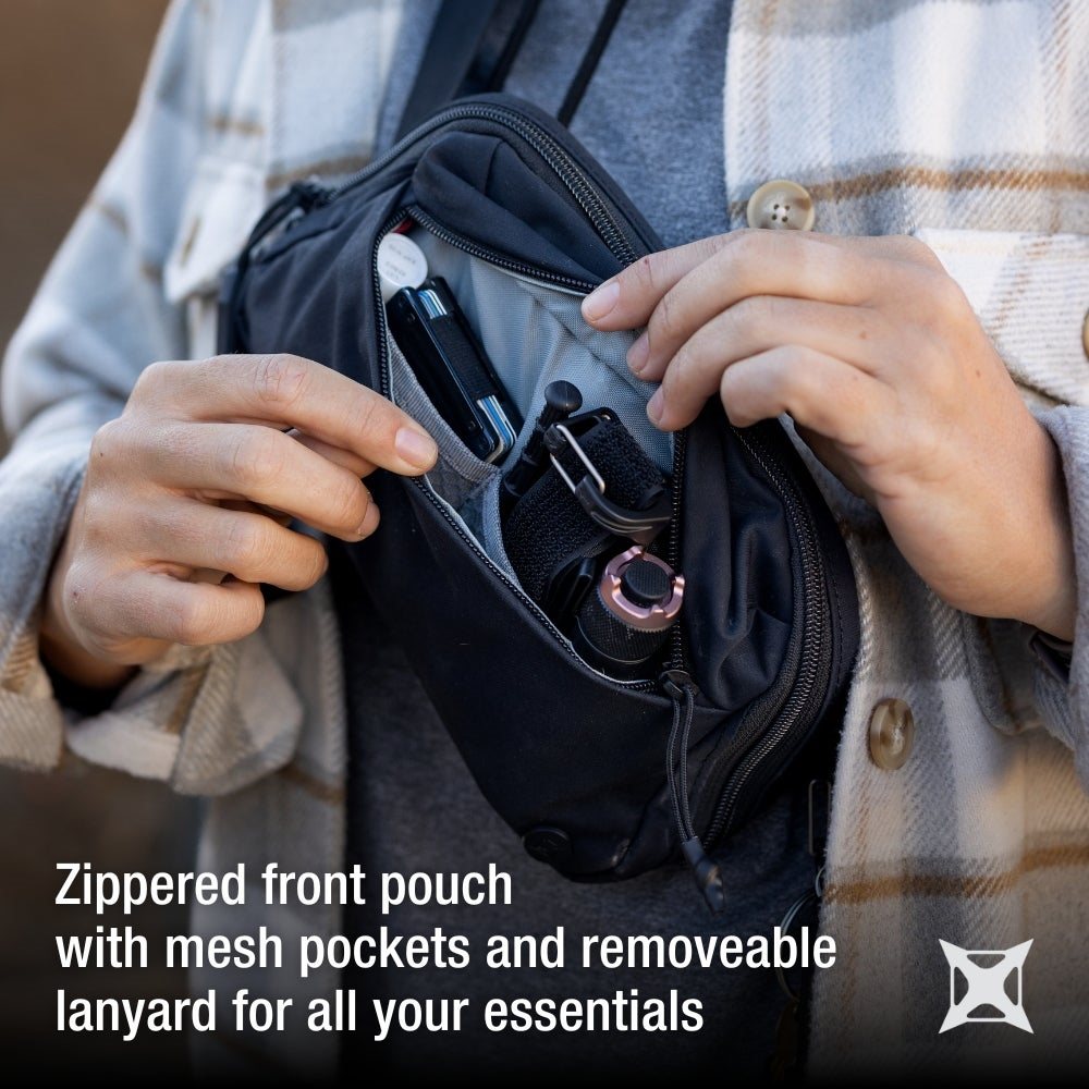 • Stay Organized: The front zippered pocket includes a removeable key lanyard and mesh pockets, giving you easy access to your everyday essentials.